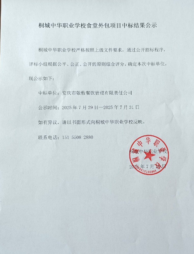 - 2025-07-29桐城中華職業學校食堂外包中標結果公示